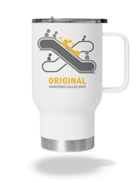 Néha azt mondjuk rá, hogy eredeti, néha meg azt, hogy idióta. Jégcsákánnyal felmászni a mozgólépcsőn... hát nagyon eredeti... de kissé idióta dolog, nem? De legalább sisak is van a hegymászónk fején. A Darwin-díjra jelöltet ábrázoló pólókat és pulóvereket RAX tervezte neked.