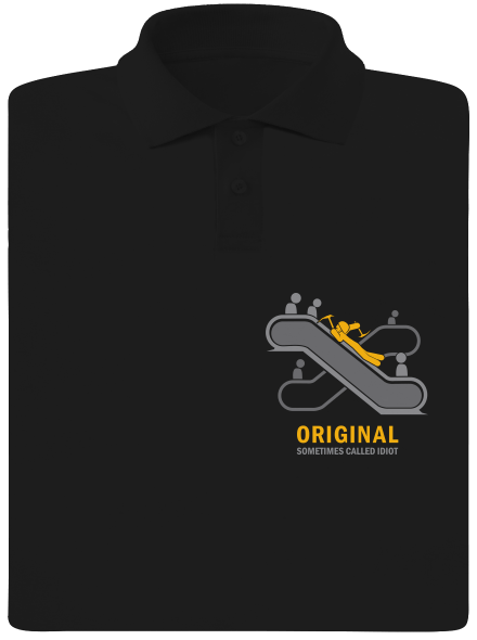 Néha azt mondjuk rá, hogy eredeti, néha meg azt, hogy idióta. Jégcsákánnyal felmászni a mozgólépcsőn... hát nagyon eredeti... de kissé idióta dolog, nem? De legalább sisak is van a hegymászónk fején. A Darwin-díjra jelöltet ábrázoló pólókat és pulóvereket RAX tervezte neked.