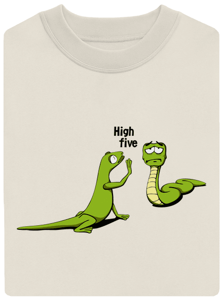 Szeva kígyó nyomj egy ötöst. Ehm, ez nem pont egy tökéletes köszönés mód a kígyóknál. Szegény kígyó csak egy high egyre képes. Ettől csak teljesen mérges lesz miközben egy csepp méreg sincs a testében mert csak egy vízisikló. Úgy látszik a gyík egy komoly leckére vágyik és meg is kapja, ha nem kér elnézést a kígyótól. Ez után nem az ujjakat hanem az angyalokat fogja számolni. Legyünk megértőek a fogyatékkal szenvedő társaink irányt. Póló nem csak terráriumosoknak.