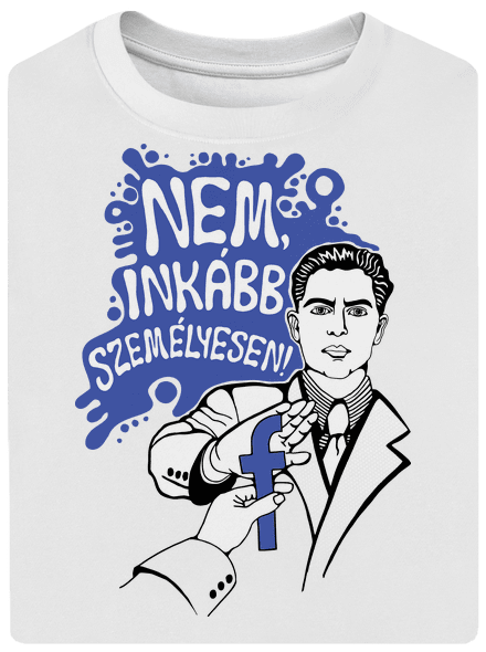 Mindenki a Facebookon lóg, ahelyett, hogy a barátaival lógna és átélne valamit. Folyton csak a képernyőt bámuljuk, veszetten gyűjtjük a lájkokat a béna szelfikért, félresikerült kajafotókért és az idétlen mottókért. Pedig az egész nem vezet sehova. Hány lájkot kell még begyűjtenünk ahhoz, hogy rájöjjünk, hogy a valódi és megismételhetetlen élmények offline várnak? Mi azt mondjuk: "Elég volt, mától kezdve inkább személyesen!" Ezt a pólót azoknak ajánljuk, akik szeretnének kiszabadulni a Zuckerberg-birodalom szorításából.