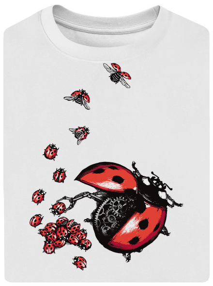 Tudod, hogyan születnek a katicák? Mi van? Az iskolában azt mesélték be neked, hogy a hétpettyes katicabogár egy bogárfajta? Dehogyis, ezen a nyomaton a saját szemeddel láthatsz egy katicagyárat! Itt mindegyik kis katicát alkatrészekből szerelnek össze és engedik ki a világba. A katicagyár nyomata női és férfi pólókon és pulóvereken kapható. Elölről egy kis katicabogár, hátulról pedig egy nagy gyár – ne gondolkozz, rendelj!